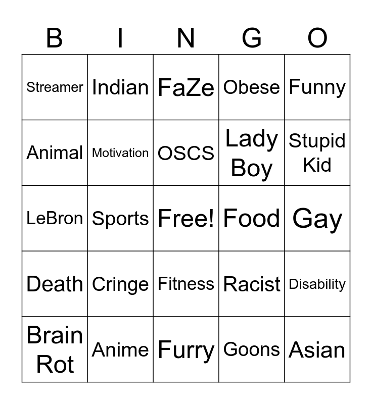 This bingo card has a free space and 24 words: Cringe, Anime, OSCS, Brain Rot, Funny, Streamer, Animal, Indian, Food, Fitness, Lady Boy, LeBron, Racist, Disability, Motivation, Goons, Gay, FaZe, Stupid Kid, Sports, Asian, Death, Obese and Furry.