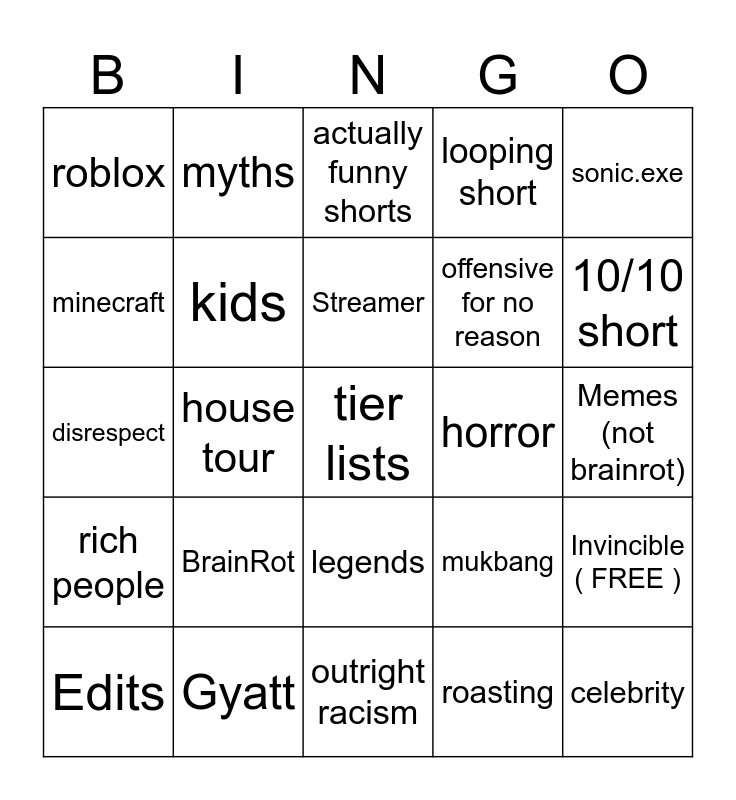 This bingo card has a free space and 24 words: BrainRot, Gyatt, Streamer, Edits, sonic.exe, roblox, minecraft, myths, horror, legends, offensive for no reason, disrespect, mukbang, Invincible ( FREE ), kids, roasting, Memes (not brainrot), actually funny shorts, 10/10 short, house tour, celebrity, rich people, looping short and outright racism.