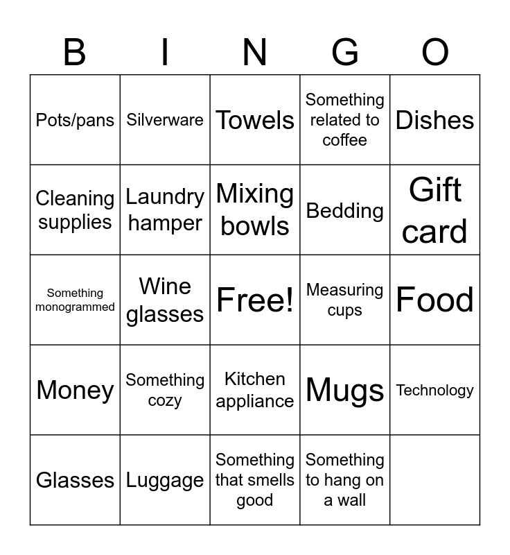 This bingo card has a free space and 24 words: Money, Luggage, Kitchen appliance, Mugs, Dishes, Pots/pans, Silverware, Towels, Bedding, Technology, Cleaning supplies, Laundry hamper, Decorations, Measuring cups, Gift card, Glasses, Wine glasses, Mixing bowls, Something related to coffee, Food, Something monogrammed, Something cozy, Something that smells good and Something to hang on a wall.