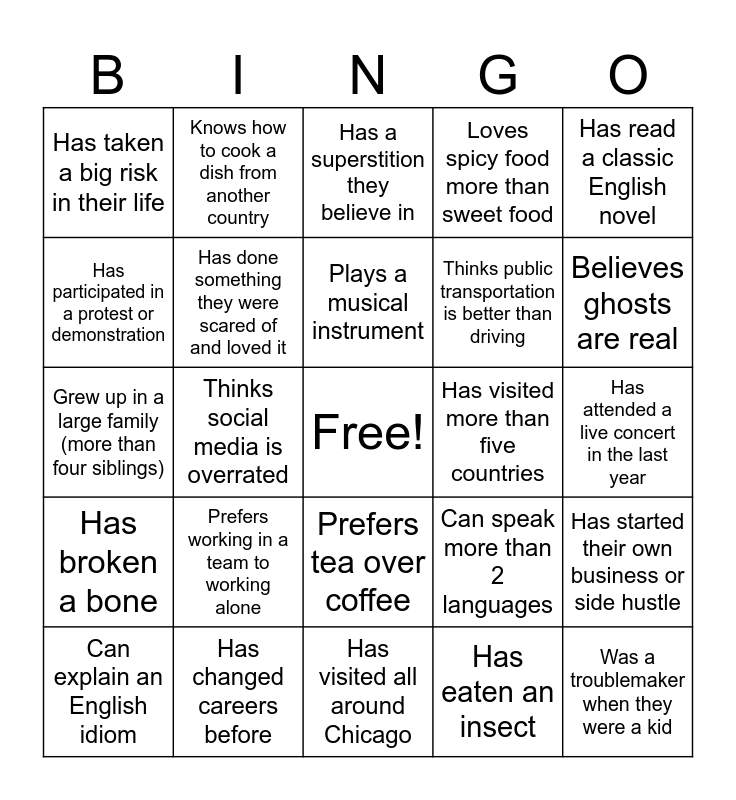 This bingo card has a free space and 24 words: Prefers working in a team to working alone, Has changed careers before, Plays a musical instrument, Can explain an English idiom, Has read a classic English novel, Has taken a big risk in their life, Has participated in a protest or demonstration, Knows how to cook a dish from another country, Has visited more than five countries, Prefers tea over coffee, Thinks public transportation is better than driving, Grew up in a large family (more than four siblings), Can speak more than 2 languages, Has started their own business or side hustle, Has done something they were scared of and loved it, Has eaten an insect, Has attended a live concert in the last year, Has a superstition they believe in, Believes ghosts are real, Thinks social media is overrated, Was a troublemaker when they were a kid, Has broken a bone, Loves spicy food more than sweet food and Has visited all around Chicago.