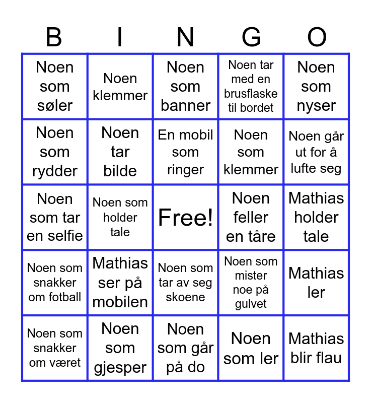 This bingo card has a free space and 24 words: Mathias ser på mobilen, Noen som gjesper, En mobil som ringer, Noen som snakker om været, Noen som nyser, Noen som søler, Noen som rydder, Noen klemmer, Noen feller en tåre, Noen som tar av seg skoene, Noen som klemmer, Noen som tar en selfie, Noen som mister noe på gulvet, Mathias ler, Noen tar bilde, Noen som ler, Mathias holder tale, Noen som banner, Noen går ut for å lufte seg, Noen som holder tale, Mathias blir flau, Noen som snakker om fotball, Noen tar med en brusflaske til bordet and Noen som går på do.