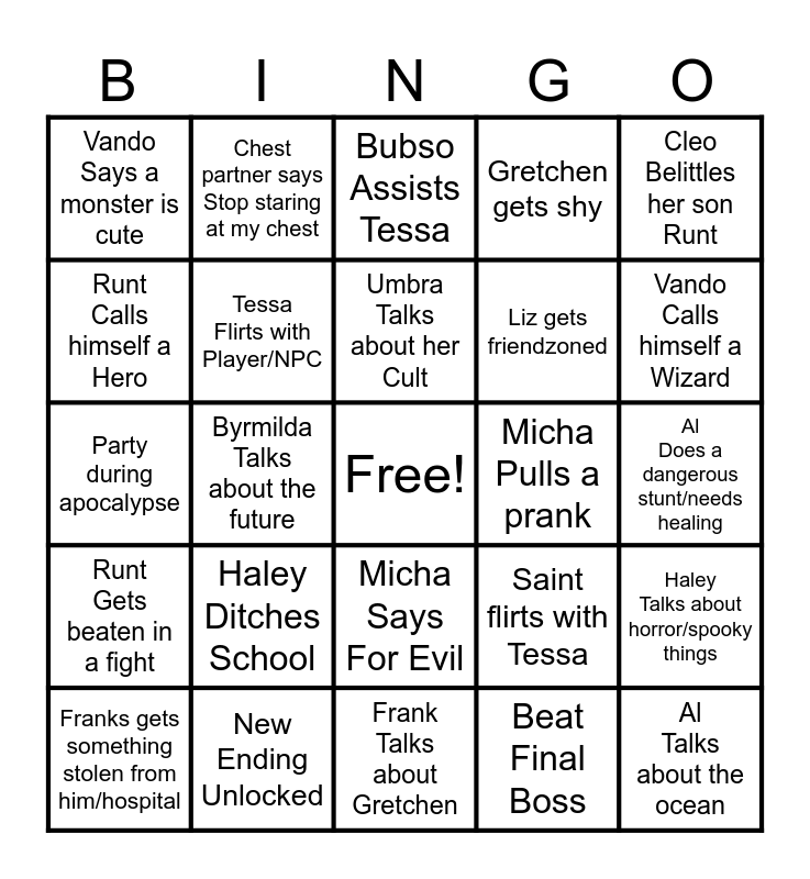 This bingo card has a free space and 37 words: Narcella and Cleo fight/bicker, Narcella Talks about the dungeon, Tessa Brings up a money scheme, Tessa Flirts with Player/NPC, Haley Talks about horror/spooky things, Haley Ditches School, Umbra Talks about her Cult, Umbra Talks about her parents, Cleo Belittles her son Runt, Byrmilda Does an experiment, Byrmilda Talks about the future, Gretchen gets shy, Al Talks about the ocean, Al Does a dangerous stunt/needs healing, Runt Calls himself a Hero, Runt Gets beaten in a fight, Bubso Talks about woodworking, Bubso Assists Tessa, Micha Says For Evil, Micha Pulls a prank, Vando Says a monster is cute, Vando Calls himself a Wizard, Franks gets something stolen from him/hospital, Frank Talks about Gretchen, Player Dies, Beat Final Boss, Chest partner says Stop staring at my chest, Player gets the penetrator, Megabear makes an appearance, Player stops at the shop, Player gets friendzoned, New Ending Unlocked, Party during apocalypse, Boar does a bad Vando impression, Saint flirts with Tessa, Liz gets friendzoned and Side character shows up (ex: demon and axel).