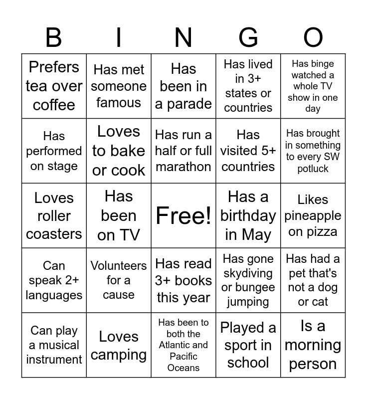 This bingo card has a free space and 28 words: Has had a pet that's not a dog or cat, Has been scuba diving or snorkeling, Has visited 5+ countries, Played a sport in school, Has performed on stage, Has been in a parade, Has met someone famous, Can speak 2+ languages, Has a birthday in May, Can play a musical instrument, Loves roller coasters, Has lived in 3+ states or countries, Loves camping, Has been to both the Atlantic and Pacific Oceans, Has brought in something to every SW potluck, Likes spicy food, Volunteers for a cause, Loves to bake or cook, Has run a half or full marathon, Has read 3+ books this year, Prefers tea over coffee, Enjoys scary movies, Is a morning person, Has been on TV, Likes pineapple on pizza, Has gone skydiving or bungee jumping, Has binge watched a whole TV show in one day and Can perform a magic trick.