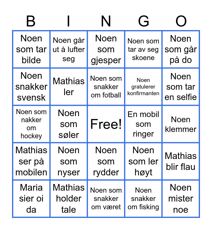 This bingo card has a free space and 24 words: Noen som nyser, Mathias holder tale, Noen som snakker om fotball, Maria sier oi da, Noen som går på do, Noen som tar bilde, Noen snakker svensk, Noen går ut å lufter seg, En mobil som ringer, Noen som rydder, Noen gratulerer konfirmanten, Noen som nakker om hockey, Noen som ler høyt, Mathias blir flau, Mathias ler, Noen snakker om fisking, Noen klemmer, Noen som gjesper, Noen som tar en selfie, Noen som søler, Noen mister noe, Mathias ser på mobilen, Noen som tar av seg skoene and Noen som snakker om været.