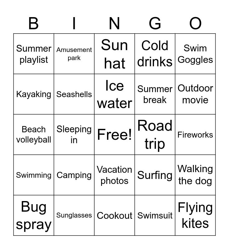 This bingo card has a free space and 30 words: Sunglasses, Beach, Sleeping in, Sunscreen, Summer playlist, Sun hat, Seashells, Vacation photos, Road trip, Cookout, Fireworks, Flying kites, Swimsuit, Bike ride, Outdoor movie, Air conditioning, Surfing, Swimming, Camping, Swim Goggles, Beach volleyball, Sunflowers, Amusement park, Summer break, Kayaking, Cold drinks, Walking the dog, Bug spray, Ice water and Lemonade.