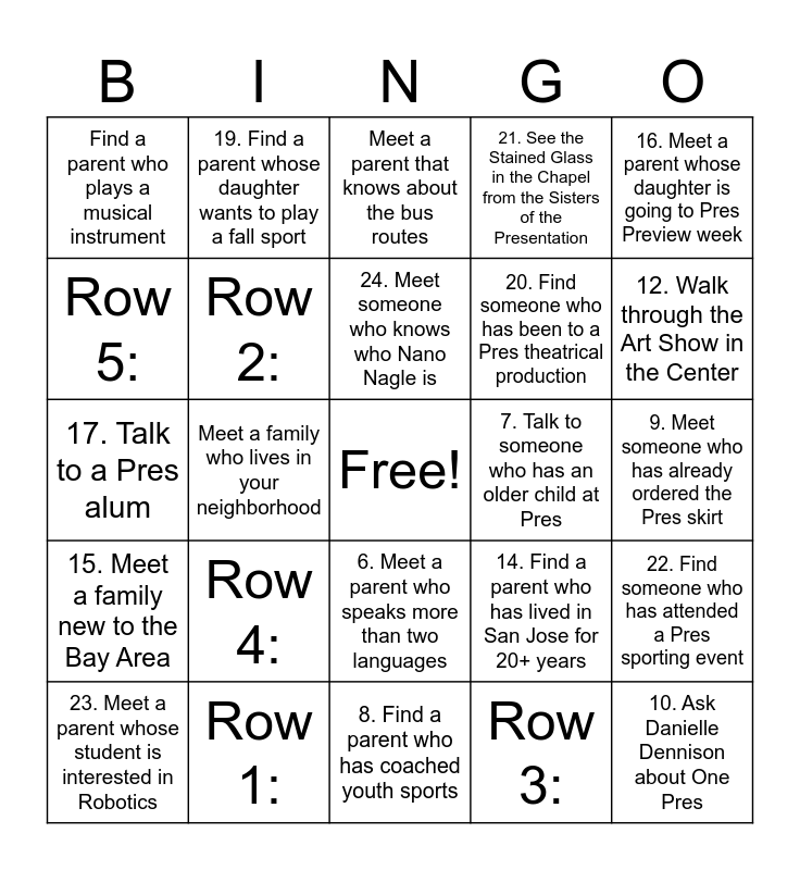 This bingo card has a free space and 30 words: Row 1:, Find a parent from your child's middle school, Meet a family who lives in your neighborhood, Visit Admissions Volunteer Table, Find a parent who plays a musical instrument, Meet a parent that knows about the bus routes, Row 2:, 6. Meet a parent who speaks more than two languages, 7. Talk to someone who has an older child at Pres, 8. Find a parent who has coached youth sports, 9. Meet someone who has already ordered the Pres skirt, 10. Ask Danielle Dennison about One Pres, Row 3:, 11. Find someone who bought Pres Swag today!, 12. Walk through the Art Show in the Center, 13. FREE SPACE - Welcome to Pres!, 14. Find a parent who has lived in San Jose for 20+ years, 15. Meet a family new to the Bay Area, Row 4:, 16. Meet a parent whose daughter is going to Pres Preview week, 17. Talk to a Pres alum, 18. Find a parent whose daughter wants to join the dance team, 19. Find a parent whose daughter wants to play a fall sport, 20. Find someone who has been to a Pres theatrical production, Row 5:, 21. See the Stained Glass in the Chapel from the Sisters of the Presentation, 22. Find someone who has attended a Pres sporting event, 23. Meet a parent whose student is interested in Robotics, 24. Meet someone who knows who Nano Nagle is and 25. Talk to someone going to the Testarossa Parent Social this evening!.