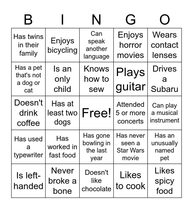 This bingo card has a free space and 29 words: Is left-handed, Has a birthday this month, Has at least two dogs, Has been in a play, Has twins in their family, Can speak another language, Is an only child, Has worked in fast food, Attended 5 or more concerts, Never broke a bone, Can play a musical instrument, Likes spicy food, Doesn't like chocolate, Likes to cook, Drives a Subaru, Has an unusual hobby, Has gone bowling in the last year, Has used a typewriter, Wears contact lenses, Doesn't drink coffee, Has never seen a Star Wars movie, Doesn't have Facebook, Plays guitar, Has a pet that's not a dog or cat, Enjoys horror movies, Enjoys bicycling, Has an unusually named pet, Knows how to sew and Dislikes tomatoes.