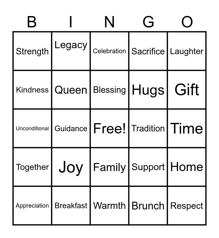 This bingo card has a free space and 39 words: Patience, Role Model, Caring, Queen, Appreciation, Family, Blessing, Love, Laughter, Together, Guidance, Sacrifice, Respect, Time, Tradition, Joy, Selfless, Strength, Love Note, Support, Kindness, Warmth, Hugs, Gift, Flowers, Card, Mom, Compassion, Heart, Legacy, Devotion, Memories, Celebration, Breakfast, Brunch, Affection, Home, Unconditional and Sweet.