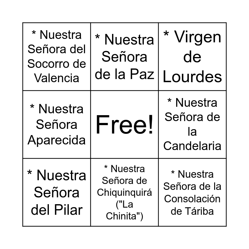 This bingo card has a free space and 24 words: * Nuestra Señora de Coromoto, * Nuestra Señora del Valle, * Nuestra Señora de Chiquinquirá ("La Chinita"), * Nuestra Señora de la Divina Pastora, * Nuestra Señora de la Consolación de Táriba, * Nuestra Señora del Socorro de Valencia, * Nuestra Señora de la Candelaria, * Nuestra Señora de la Paz, * Nuestra Señora de Belén, * Nuestra Señora de las Nieves, * María Auxiliadora, * Nuestra Señora del Carmen, * Nuestra Señora de la Merced, * Nuestra Señora de la Inmaculada Concepción, * Nuestra Señora del Pilar, * Virgen de Guadalupe, * Virgen de Fátima, * Virgen de Lourdes, * Virgen de Loreto, * Virgen de Montserrat ("La Moreneta"), * Rosa Mística, * Nuestra Señora del Perpetuo Socorro, * Nuestra Señora Aparecida and * Virgen de la Macarena.