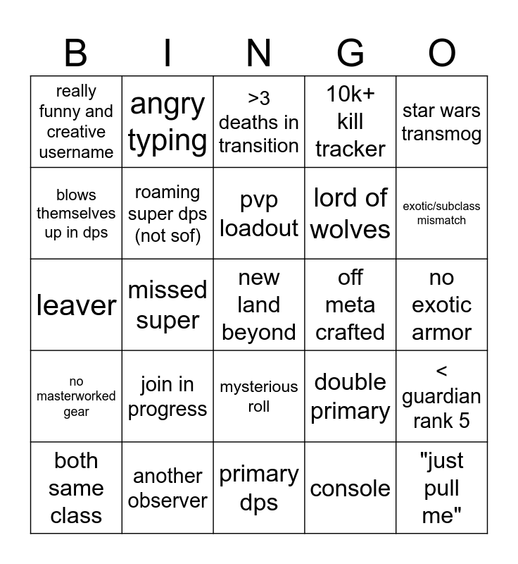This bingo card has a free space and 24 words: both same class, join in progress, pvp loadout, console, star wars transmog, really funny and creative username, angry typing, >3 deaths in transition, off meta crafted, no exotic armor, leaver, roaming super dps (not sof), double primary, < guardian rank 5, blows themselves up in dps, another observer, primary dps, 10k+ kill tracker, exotic/subclass mismatch, no masterworked gear, missed super, mysterious roll, lord of wolves and "just pull me".