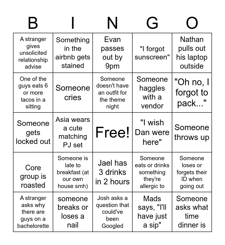 This bingo card has a free space and 31 words: Josh asks a question that could've been Googled, The airdrop fails, Asia wears a cute matching PJ set, Someone brings up online dating, A stranger gives unsolicited relationship advise, Evan passes out by 9pm, Someone cries, Someone eats or drinks something they're allergic to, "I wish Dan were here", Mads says, "I'll have just a sip", Someone throws up, Someone asks what time dinner is, Justin wears a Hawaiian/bold printed shirt, "I hate sand", "Oh no, I forgot to pack...", Someone complains about their hair loss, Someone loses or forgets their ID when going out, Someone is late to breakfast (at our own house smh), Core group is roasted, Jael has 3 drinks in 2 hours, Nathan pulls out his laptop outside, Jael talks wedding details at a meal time, A stranger asks why there are guys on a bachelorette, Something in the airbnb gets stained, Someone haggles with a vendor, One of the guys eats 6 or more tacos in a sitting, "I forgot sunscreen", Someone gets locked out, someone breaks or loses a nail, Someone doesn't have an outfit for the theme night and Someone Facetime's their mom.