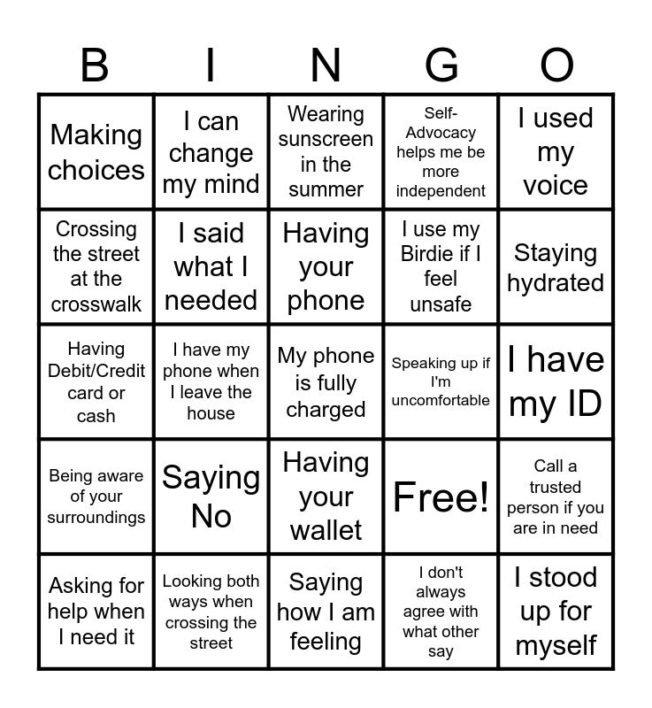 This bingo card has 25 words: Saying No, Saying how I am feeling, Having your phone, Asking for help when I need it, I used my voice, Making choices, Crossing the street at the crosswalk, I can change my mind, Speaking up if I'm uncomfortable, Having your wallet, I use my Birdie if I feel unsafe, Having Debit/Credit card or cash, Free!, Call a trusted person if you are in need, I said what I needed, I stood up for myself, I have my ID, Wearing sunscreen in the summer, Staying hydrated, I have my phone when I leave the house, My phone is fully charged, Looking both ways when crossing the street, Being aware of your surroundings, Self-Advocacy helps me be more independent and I don't always agree with what other say.