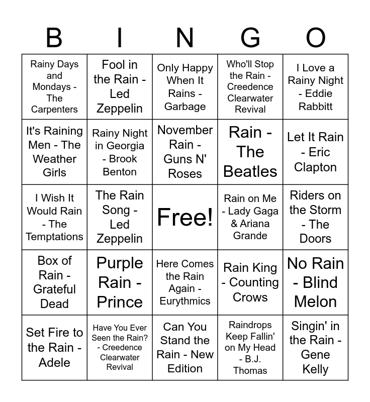 This bingo card has a free space and 24 words: Purple Rain - Prince, Have You Ever Seen the Rain? - Creedence Clearwater Revival, November Rain - Guns N' Roses, Set Fire to the Rain - Adele, I Love a Rainy Night - Eddie Rabbitt, Rainy Days and Mondays - The Carpenters, It's Raining Men - The Weather Girls, Fool in the Rain - Led Zeppelin, Rain on Me - Lady Gaga & Ariana Grande, Here Comes the Rain Again - Eurythmics, Rain - The Beatles, I Wish It Would Rain - The Temptations, Rain King - Counting Crows, No Rain - Blind Melon, Rainy Night in Georgia - Brook Benton, Raindrops Keep Fallin' on My Head - B.J. Thomas, Riders on the Storm - The Doors, Only Happy When It Rains - Garbage, Let It Rain - Eric Clapton, The Rain Song - Led Zeppelin, Singin' in the Rain - Gene Kelly, Box of Rain - Grateful Dead, Who'll Stop the Rain - Creedence Clearwater Revival and Can You Stand the Rain - New Edition.