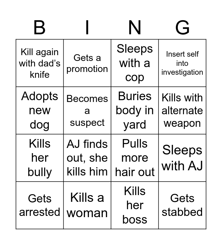 This bingo card has 16 words: Kills a woman, Sleeps with AJ, Sleeps with a cop, Kill again with dad’s knife, Kills her bully, Gets a promotion, Pulls more hair out, Kills her boss, Adopts new dog, Becomes a suspect, Gets arrested, Insert self into investigation, AJ finds out, she kills him, Kills with alternate weapon, Buries body in yard and Gets stabbed.