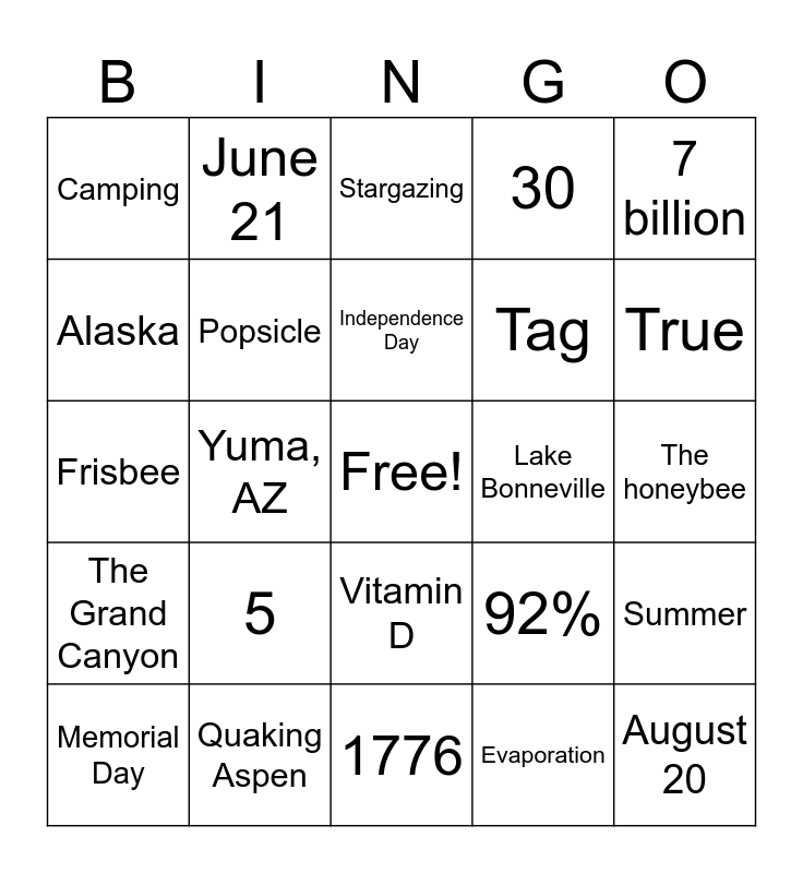 This bingo card has a free space and 29 words: Memorial Day, Flag Day, Yuma, AZ, Chicago, IL, Camping, Stargazing, Popsicle, 5, Lake Bonneville, Quaking Aspen, The honeybee, August 20, 1776, Evaporation, True, False, Vitamin D, The Grand Canyon, 7 billion, Frisbee, 92%, 1 billion, Tag, Alaska, 30, June 21, Summer, Independence Day and Summer Olympic Games.