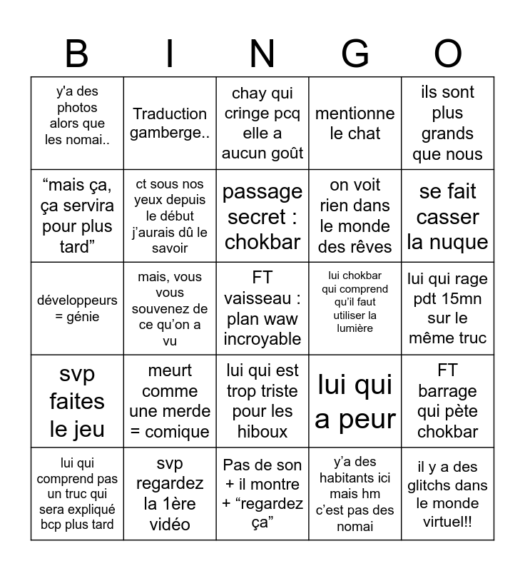 This bingo card has 25 words: svp faites le jeu, svp regardez la 1ère vidéo, FT vaisseau : plan waw incroyable, y’a des habitants ici mais hm c’est pas des nomai, ils sont plus grands que nous, y'a des photos alors que les nomai.., Traduction gamberge.., chay qui cringe pcq elle a aucun goût, lui chokbar qui comprend qu’il faut utiliser la lumière, FT barrage qui pète chokbar, “mais ça, ça servira pour plus tard”, ct sous nos yeux depuis le début j’aurais dû le savoir, Pas de son + il montre + “regardez ça”, lui qui a peur, se fait casser la nuque, lui qui comprend pas un truc qui sera expliqué bcp plus tard, mais, vous vous souvenez de ce qu’on a vu, passage secret : chokbar, on voit rien dans le monde des rêves, lui qui rage pdt 15mn sur le même truc, développeurs = génie, meurt comme une merde = comique, lui qui est trop triste pour les hiboux, mentionne le chat and il y a des glitchs dans le monde virtuel!!.