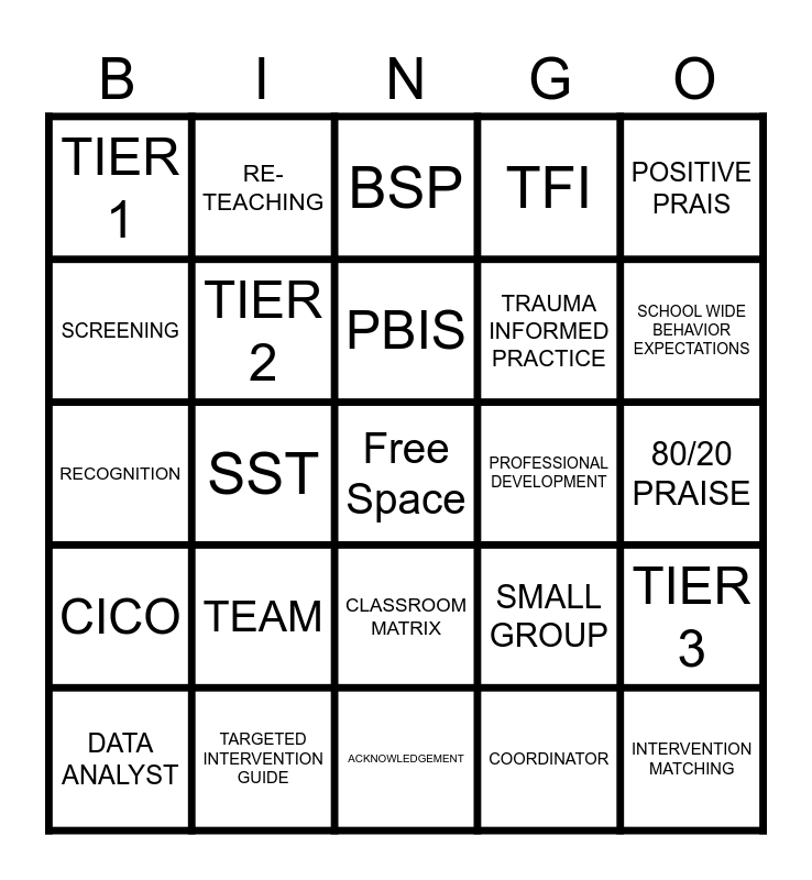 This bingo card has a free space and 24 words: TEAM, TARGETED INTERVENTION GUIDE, PBIS, DATA ANALYST, POSITIVE PRAIS, TIER 1, SCREENING, RE-TEACHING, PROFESSIONAL DEVELOPMENT, CLASSROOM MATRIX, TRAUMA INFORMED PRACTICE, RECOGNITION, SMALL GROUP, TIER 3, TIER 2, COORDINATOR, 80/20 PRAISE, BSP, SCHOOL WIDE BEHAVIOR EXPECTATIONS, SST, INTERVENTION MATCHING, CICO, TFI and ACKNOWLEDGEMENT.