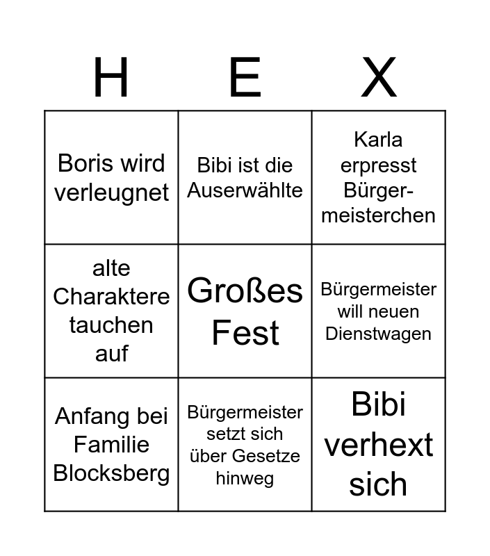 This bingo card has a free space and 8 words: Bürgermeister will neuen Dienstwagen, Karla erpresst Bürger-meisterchen, Bibi ist die Auserwählte, Anfang bei Familie Blocksberg, Boris wird verleugnet, Bibi verhext sich, alte Charaktere tauchen auf and Bürgermeister setzt sich über Gesetze hinweg.