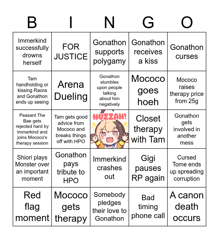 This bingo card has a free space and 24 words: Gonathon pays tribute to HPO, Mococo gets therapy, Gonathon stumbles upon people talking about him negatively, Red flag moment, Gonathon curses, Immerkind successfully drowns herself, Tam handholding or kissing Raora and Gonathon ends up seeing, FOR JUSTICE, Closet therapy with Tam, Immerkind crashes out, Mococo goes hoeh, Peasant The Bae gets rejected hard by Immerkind and joins Mococo's therapy session, Gigi pauses RP again, Cursed Tome ends up spreading corruption, Arena Dueling, Bad timing phone call, Gonathon gets involved in another mess, Gonathon supports polygamy, Mococo raises therapy price from 25g, Tam gets good advice from Mococo and breaks things off with HPO, A canon death occurs, Shiori plays Monster over an important moment, Gonathon receives a kiss and Somebody pledges their love to Gonathon.