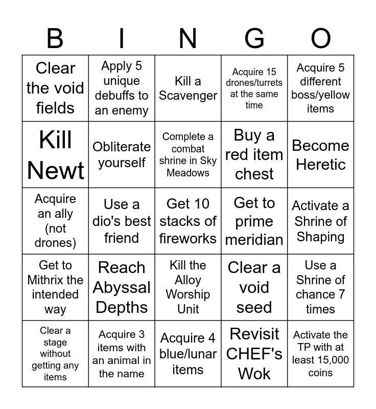 This bingo card has 55 words: Complete a run (however that may be), Clear a stage without getting any items, Kill Voidling, Clear the void fields, Acquire 4 blue/lunar items, Kill the False son, Obliterate yourself, Acquire TC-280 Prototype, Buy a red item chest, Get 20 stacks of the same item, Acquire 15 drones/turrets at the same time, active 2 challenge of the mountains in a single area, Complete a Halcyon Shrine, Kill Mithrix, Break 5 delicate watches at the same time, Complete stage 5, Acquire 5 different boss/yellow items, Use a dio's best friend, Get a cautious slug, med kit, bustling fungus and monster tooth, Get 10 stacks of fireworks, Get to prime meridian, Corrupt a normal item into a void item, Clear a void seed, Kill a Scavenger, Get to stage 10 with no red items, Complete a combat shrine in Sky Meadows, Revisit CHEF's Wok, Revisit where you unlocked REX, Activate a Shrine of Shaping, Use a Shrine of chance 7 times, Activate 2 Shine of Woods in the same area, Open a cloaked chest, Acquire a red from a normal chest (any chest that isnt a red chest), Kill a Void Devastator, Kill Newt, Acquire an ally (not drones), Clear an area without using primary attack, Get to Mithrix the intended way, Activate the TP with at least 15,000 coins, Feelin jumpy? (10 hopoo feathers), Apply 5 unique debuffs to an enemy, Acquire 10 stacks of bison steak, Open a Rusty lockbox, Reach the Siphoned forest, Reach Abyssal Depths, Acquire 3 items with an animal in the name, Get a goat hoof, energy drink, mocha and a wax quail, Acquire spare drone parts, Beat an area hitless, Become Heretic, Get 5 stacks of Death mark, Acquire gasoline, Molotov, Ignition tank and Molten Perforator, Acquire 3 different Red items, Kill the Alloy Worship Unit and Kill Aurelionite.