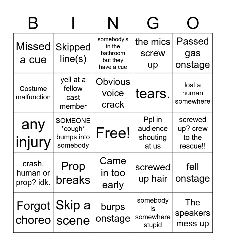 This bingo card has a free space and 24 words: Prop breaks, Skip a scene, Obvious voice crack, Forgot choreo, Passed gas onstage, Missed a cue, Costume malfunction, Skipped line(s), Ppl in audience shouting at us, Came in too early, tears., any injury, screwed up hair, fell onstage, yell at a fellow cast member, somebody is somewhere stupid, screwed up? crew to the rescue!!, somebody’s in the bathroom but they have a cue, lost a human somewhere, SOMEONE *cough* bumps into somebody, The speakers mess up, crash. human or prop? idk., the mics screw up and burps onstage.