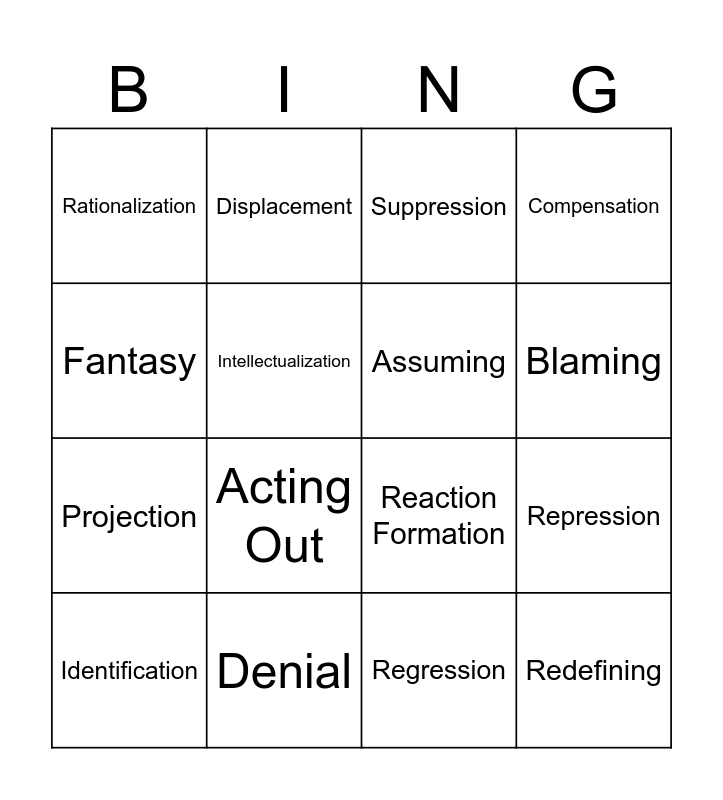 This bingo card has 16 words: Denial, Repression, Suppression, Rationalization, Projection, Displacement, Reaction Formation, Regression, Fantasy, Intellectualization, Identification, Compensation, Acting Out, Blaming, Assuming and Redefining.