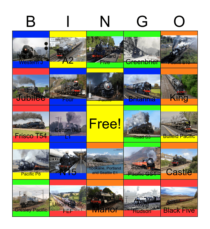 This bingo card has 24 images, a free space and 24 words: N15, Union Pacific FEF, USRA Heavy Pacific, Gresley Pacific, Northern Pacific S10, Norfolk and Western J, Jubilee, A2, Milwaukee Road S3, Spokane, Portland and Seattle E1, Britannia, Frisco T54, Southern Pacific GS4, Castle, Standard Four, Royal Hudson, Bulleid Pacific, Standard Five, King, Cotton Belt L1, Black Five, Southern Pacific P8, Greenbrier and Manor.