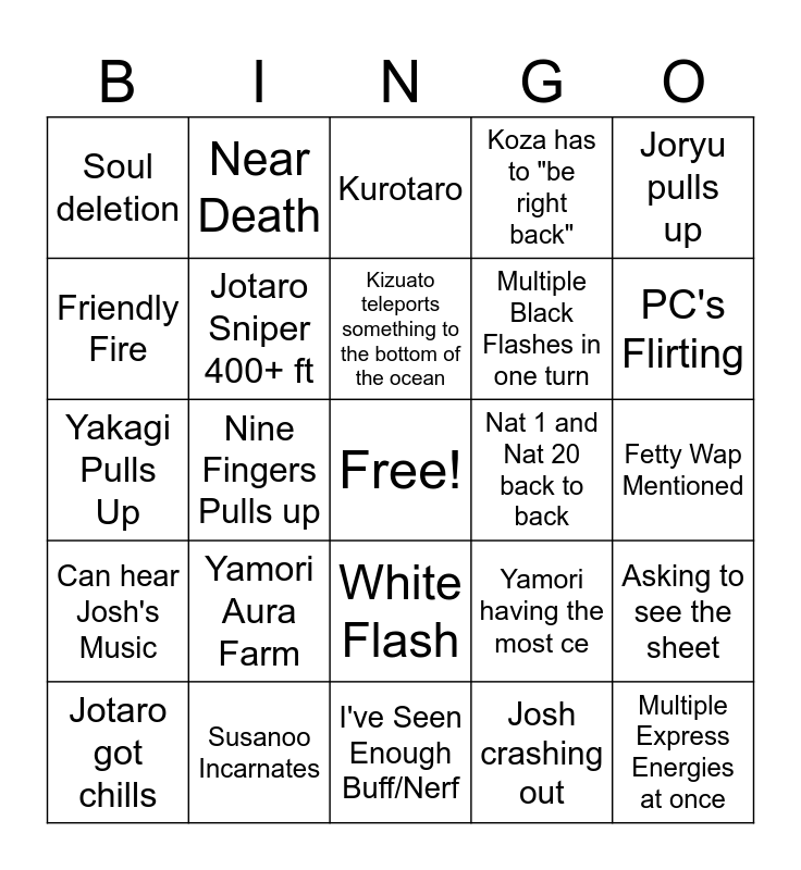 This bingo card has a free space and 24 words: Yamori Aura Farm, Susanoo Incarnates, Kizuato teleports something to the bottom of the ocean, Jotaro got chills, Joryu pulls up, Soul deletion, Friendly Fire, Near Death, Nat 1 and Nat 20 back to back, White Flash, Multiple Black Flashes in one turn, Yakagi Pulls Up, Yamori having the most ce, Asking to see the sheet, Jotaro Sniper 400+ ft, Josh crashing out, Fetty Wap Mentioned, Kurotaro, PC's Flirting, Nine Fingers Pulls up, Multiple Express Energies at once, Can hear Josh's Music, Koza has to "be right back" and I've Seen Enough Buff/Nerf.