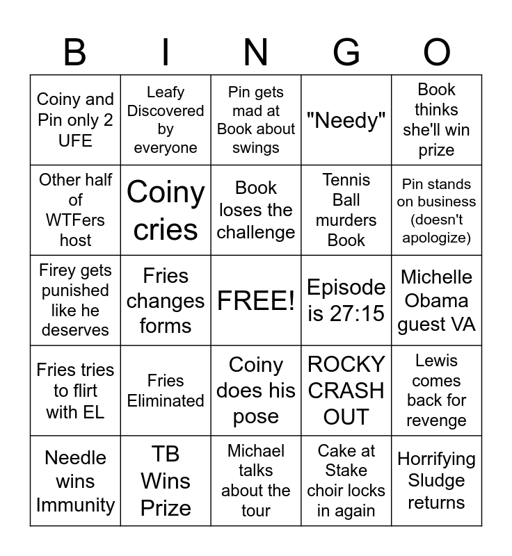This bingo card has a free space and 24 words: Fries Eliminated, TB Wins Prize, Book loses the challenge, Needle wins Immunity, Book thinks she'll win prize, Coiny and Pin only 2 UFE, Other half of WTFers host, Leafy Discovered by everyone, Episode is 27:15, Coiny does his pose, Tennis Ball murders Book, Firey gets punished like he deserves, ROCKY CRASH OUT, Lewis comes back for revenge, Coiny cries, Cake at Stake choir locks in again, Michelle Obama guest VA, Pin gets mad at Book about swings, Pin stands on business (doesn't apologize), Fries changes forms, Horrifying Sludge returns, Fries tries to flirt with EL, "Needy" and Michael talks about the tour.