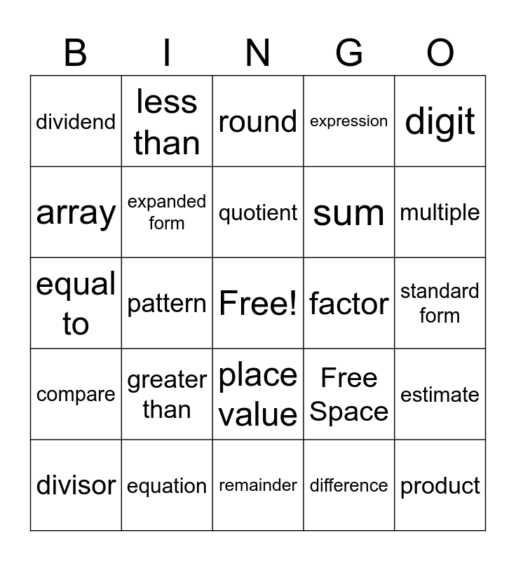 This bingo card has a free space and 25 words: greater than, remainder, quotient, divisor, digit, dividend, array, less than, factor, place value, sum, equal to, Free Space, estimate, expanded form, number line, standard form, round, multiple, pattern, product, equation, compare, expression and difference.