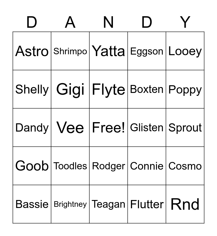 This bingo card has a free space and 29 words: Bassie, Tisha, Vee, Finn, Astro, Yatta, Gigi, Toodles, Glisten, Brightney, Sprout, Rnd, Teagan, Flutter, Poppy, Scraps, Rodger, Goob, Looey, Dandy, Connie, Pebble, Boxten, Shelly, Eggson, Shrimpo, Cosmo, Flyte and Cocoa.