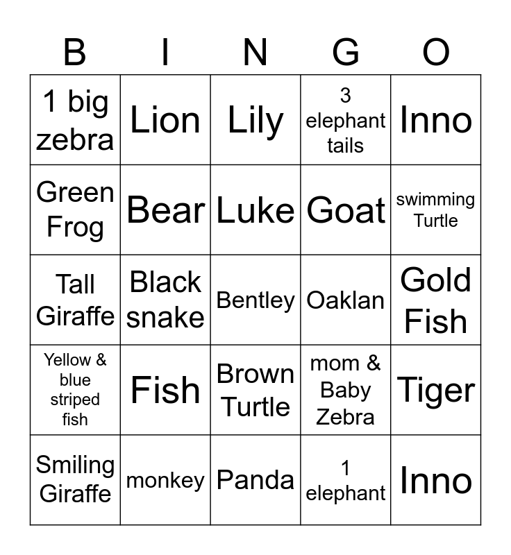 This bingo card has a free space and 24 words: Fish, monkey, Luke, Smiling Giraffe, Inno, 1 big zebra, Green Frog, Lion, Oaklan, Brown Turtle, Goat, Tall Giraffe, mom & Baby Zebra, Tiger, Bear, 1 elephant, Gold Fish, Lily, swimming Turtle, Black snake, Inno, Yellow & blue striped fish, 3 elephant tails and Panda.