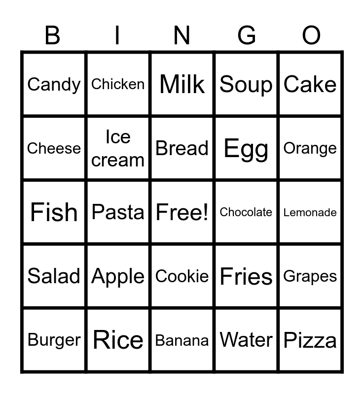 This bingo card has a free space and 25 words: Apple, Banana, Bread, Burger, Cake, Candy, Cheese, Chicken, Chocolate, Cookie, Egg, Fish, Fries, Grapes, Ice cream, Juice, Lemonade, Milk, Orange, Pasta, Pizza, Rice, Salad, Soup and Water.