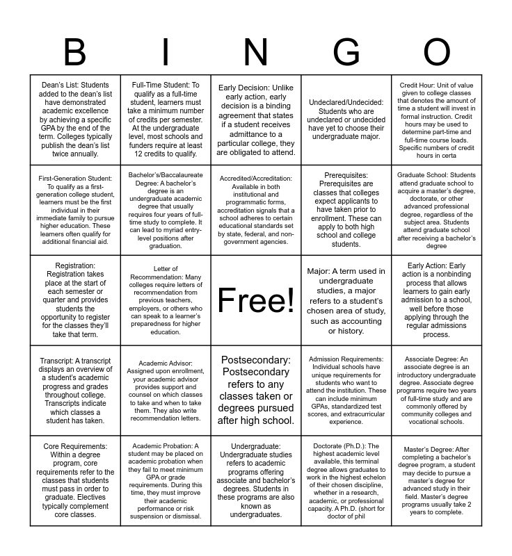 This bingo card has a free space and 24 words: Academic Advisor: Assigned upon enrollment, your academic advisor provides support and counsel on which classes to take and when to take them. They also write recommendation letters., Academic Probation: A student may be placed on academic probation when they fail to meet minimum GPA or grade requirements. During this time, they must improve their academic performance or risk suspension or dismissal., Accredited/Accreditation: Available in both institutional and programmatic forms, accreditation signals that a school adheres to certain educational standards set by state, federal, and non-government agencies., Core Requirements: Within a degree program, core requirements refer to the classes that students must pass in order to graduate. Electives typically complement core classes., Credit Hour: Unit of value given to college classes that denotes the amount of time a student will invest in formal instruction. Credit hours may be used to determine part-time and full-time course loads. Specific numbers of credit hours in certa, Dean’s List: Students added to the dean’s list have demonstrated academic excellence by achieving a specific GPA by the end of the term. Colleges typically publish the dean’s list twice annually., First-Generation Student: To qualify as a first-generation college student, learners must be the first individual in their immediate family to pursue higher education. These learners often qualify for additional financial aid., Full-Time Student: To qualify as a full-time student, learners must take a minimum number of credits per semester. At the undergraduate level, most schools and funders require at least 12 credits to qualify., Major: A term used in undergraduate studies, a major refers to a student’s chosen area of study, such as accounting or history., Postsecondary: Postsecondary refers to any classes taken or degrees pursued after high school., Prerequisites: Prerequisites are classes that colleges expect applicants to have taken prior to enrollment. These can apply to both high school and college students., Registration: Registration takes place at the start of each semester or quarter and provides students the opportunity to register for the classes they’ll take that term., Admission Requirements: Individual schools have unique requirements for students who want to attend the institution. These can include minimum GPAs, standardized test scores, and extracurricular experience., Associate Degree: An associate degree is an introductory undergraduate degree. Associate degree programs require two years of full-time study and are commonly offered by community colleges and vocational schools., Bachelor’s/Baccalaureate Degree: A bachelor’s degree is an undergraduate academic degree that usually requires four years of full-time study to complete. It can lead to myriad entry-level positions after graduation., Doctorate (Ph.D.): The highest academic level available, this terminal degree allows graduates to work in the highest echelon of their chosen discipline, whether in a research, academic, or professional capacity. A Ph.D. (short for doctor of phil, Early Action: Early action is a nonbinding process that allows learners to gain early admission to a school, well before those applying through the regular admissions process., Early Decision: Unlike early action, early decision is a binding agreement that states if a student receives admittance to a particular college, they are obligated to attend., Graduate School: Students attend graduate school to acquire a master’s degree, doctorate, or other advanced professional degree, regardless of the subject area. Students attend graduate school after receiving a bachelor’s degree, Letter of Recommendation: Many colleges require letters of recommendation from previous teachers, employers, or others who can speak to a learner’s preparedness for higher education., Master’s Degree: After completing a bachelor’s degree program, a student may decide to pursue a master’s degree for advanced study in their field. Master’s degree programs usually take 2 years to complete., Transcript: A transcript displays an overview of a student’s academic progress and grades throughout college. Transcripts indicate which classes a student has taken., Undeclared/Undecided: Students who are undeclared or undecided have yet to choose their undergraduate major. and Undergraduate: Undergraduate studies refers to academic programs offering associate and bachelor’s degrees. Students in these programs are also known as undergraduates..
