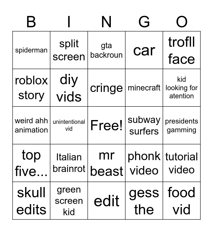 This bingo card has a free space and 24 words: Italian brainrot, green screen kid, cringe, skull edits, trofll face, spiderman, roblox story, split screen, subway surfers, mr beast, minecraft, weird ahh animation, phonk video, tutorial video, diy vids, gess the, presidents gamming, gta backroun, kid looking for atention, unintentional vid, food vid, top five..., car and edit.