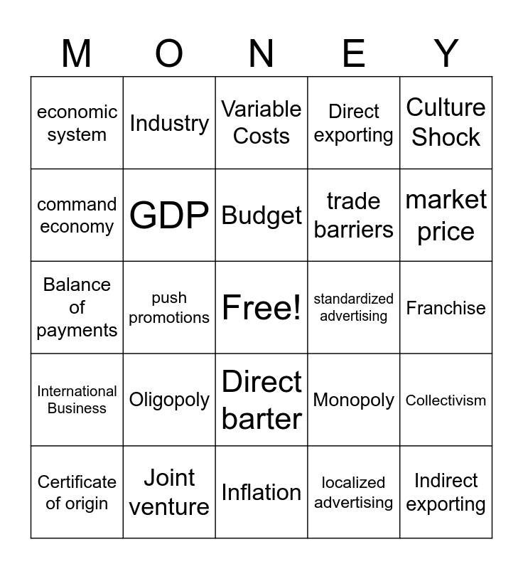 This bingo card has a free space and 32 words: localized advertising, pull promotions, push promotions, Domestic Business, International Business, GDP, Culture Shock, Collectivism, Industry, Telecommuting, Budget, Variable Costs, Dumping, Personal Selling, standardized advertising, Sales Promotion, Certificate of origin, Balance of payments, Direct barter, Oligopoly, Monopoly, Foreign Direct Investment (FDI), Franchise, Joint venture, Indirect exporting, Direct exporting, trade barriers, command economy, economic system, Inflation, Infrastructure and market price.