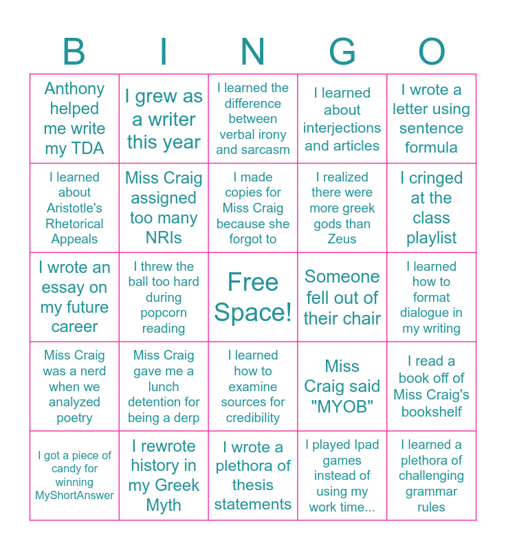 This bingo card has a free space and 29 words: I got a piece of candy for winning MyShortAnswer, I wrote snapshots using sensory details, I threw the ball too hard during popcorn reading, I learned how to quote, paraphrase, and summarize text, Anthony helped me write my TDA, I learned the difference between verbal irony and sarcasm, Miss Craig assigned too many NRIs, Miss Craig gave me a lunch detention for being a derp, Someone fell out of their chair, I rewrote history in my Greek Myth, I learned how to format dialogue in my writing, I learned a plethora of challenging grammar rules, I wrote a plethora of thesis statements, I played Ipad games instead of using my work time..., I cringed at the class playlist, I wrote a memoir about my life, I learned how to examine sources for credibility, Miss Craig was a nerd when we analyzed poetry, I wrote a letter using sentence formula, I wrote an essay on my future career, Miss Craig said "MYOB", I improved my sentence fluency by using different sentence formulas, I realized there were more greek gods than Zeus, I learned about Aristotle's Rhetorical Appeals, I learned about interjections and articles, I grew as a writer this year, I read a book off of Miss Craig's bookshelf, I made copies for Miss Craig because she forgot to and I learned how to elaborate on my evidence in analytical writing.