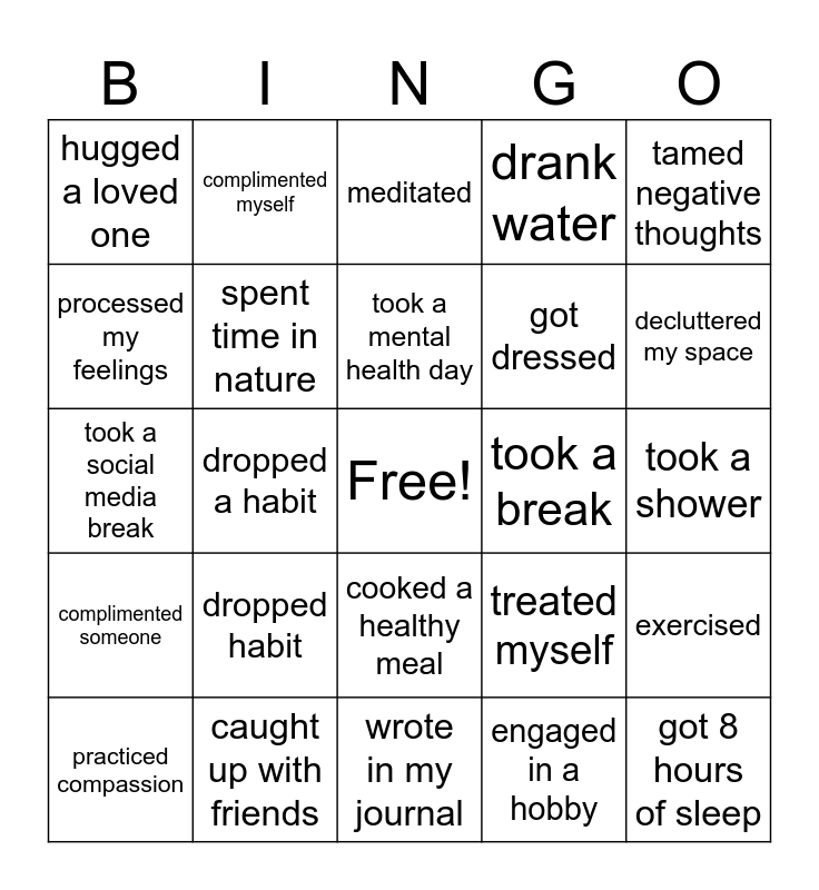 This bingo card has a free space and 25 words: dropped habit, wrote in my journal, took a mental health day, practiced compassion, tamed negative thoughts, hugged a loved one, processed my feelings, complimented myself, took a break, cooked a healthy meal, got dressed, took a social media break, treated myself, exercised, spent time in nature, played with a pet, took a shower, meditated, decluttered my space, dropped a habit, got 8 hours of sleep, caught up with friends, complimented someone, drank water and engaged in a hobby.