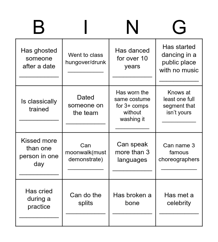 This bingo card has 16 words: Can do the splits ___________, Can name 3 famous choreographers ___________, Has danced for over 10 years ___________, Has ghosted someone after a date ___________, Kissed more than one person in one day ___________, Went to class hungover/drunk ___________, Can speak more than 3 languages ___________, Has broken a bone ___________, Is classically trained ___________, Dated someone on the team ___________, Has cried during a practice ___________, Has started dancing in a public place with no music ___________, Can moonwalk(must demonstrate) ___________, Knows at least one full segment that isn’t yours ___________, Has worn the same costume for 3+ comps without washing it ___________ and Has met a celebrity ___________.