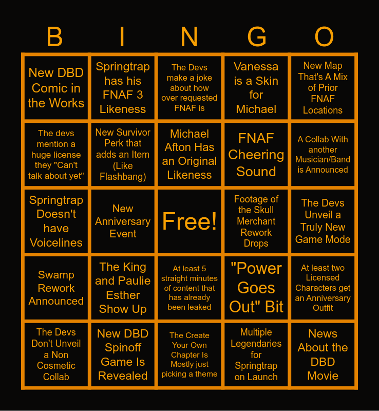 This bingo card has a free space and 24 words: The King and Paulie Esther Show Up, New DBD Spinoff Game Is Revealed, Michael Afton Has an Original Likeness, The Devs Don't Unveil a Non Cosmetic Collab, New Map That's A Mix of Prior FNAF Locations, New DBD Comic in the Works, The devs mention a huge license they "Can't talk about yet", Springtrap has his FNAF 3 Likeness, Footage of the Skull Merchant Rework Drops, At least 5 straight minutes of content that has already been leaked, FNAF Cheering Sound, Springtrap Doesn't have Voicelines, "Power Goes Out" Bit, At least two Licensed Characters get an Anniversary Outfit, New Survivor Perk that adds an Item (Like Flashbang), Multiple Legendaries for Springtrap on Launch, The Devs Unveil a Truly New Game Mode, The Devs make a joke about how over requested FNAF is, A Collab With another Musician/Band is Announced, New Anniversary Event, News About the DBD Movie, Swamp Rework Announced, Vanessa is a Skin for Michael and The Create Your Own Chapter Is Mostly just picking a theme.