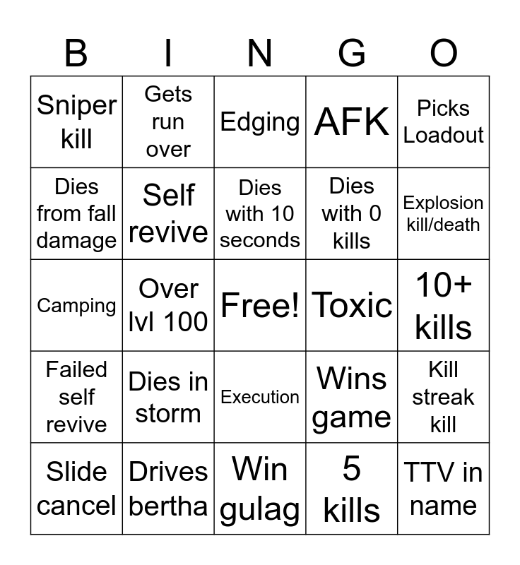 This bingo card has a free space and 24 words: Dies in storm, Drives bertha, Dies with 10 seconds, Slide cancel, Picks Loadout, Sniper kill, Dies from fall damage, Gets run over, Toxic, Execution, Dies with 0 kills, Camping, Wins game, Kill streak kill, Self revive, 5 kills, 10+ kills, Edging, Explosion kill/death, Over lvl 100, TTV in name, Failed self revive, AFK and Win gulag.