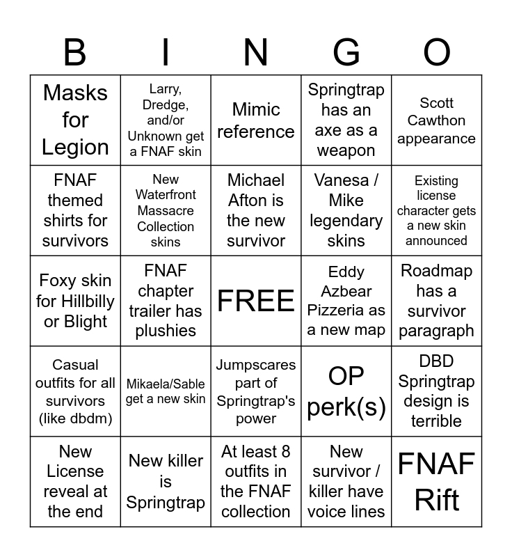 This bingo card has a free space and 24 words: Mikaela/Sable get a new skin, New killer is Springtrap, Michael Afton is the new survivor, New License reveal at the end, Scott Cawthon appearance, Masks for Legion, FNAF themed shirts for survivors, Larry, Dredge, and/or Unknown get a FNAF skin, Eddy Azbear Pizzeria as a new map, Jumpscares part of Springtrap's power, Vanesa / Mike legendary skins, Foxy skin for Hillbilly or Blight, OP perk(s), DBD Springtrap design is terrible, New Waterfront Massacre Collection skins, New survivor / killer have voice lines, Roadmap has a survivor paragraph, Mimic reference, Existing license character gets a new skin announced, FNAF chapter trailer has plushies, FNAF Rift, Casual outfits for all survivors (like dbdm), Springtrap has an axe as a weapon and At least 8 outfits in the FNAF collection.