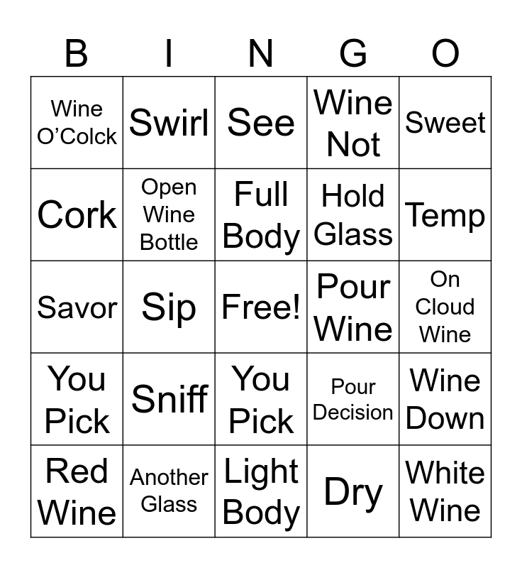 This bingo card has a free space and 24 words: Sniff, Another Glass, Full Body, Red Wine, Sweet, Wine O’Colck, Cork, Swirl, Pour Wine, You Pick, Hold Glass, Savor, Pour Decision, Wine Down, Open Wine Bottle, Dry, On Cloud Wine, See, Temp, Sip, White Wine, You Pick, Wine Not and Light Body.
