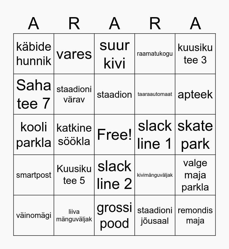This bingo card has a free space and 24 words: Kuusiku tee 5, liiva mänguväljak, staadion, väinomägi, kuusiku tee 3, käbide hunnik, Saha tee 7, vares, slack line 1, slack line 2, taaraautomaat, kooli parkla, kivimänguväljak, valge maja parkla, staadioni värav, staadioni jõusaal, skate park, suur kivi, apteek, katkine söökla, remondis maja, smartpost, raamatukogu and grossi pood.
