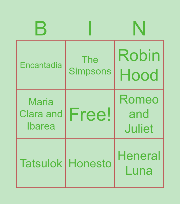 This bingo card has a free space and 8 words: Romeo and Juliet, Robin Hood, The Simpsons, Tatsulok, Encantadia, Heneral Luna, Maria Clara and Ibarea and Honesto.
