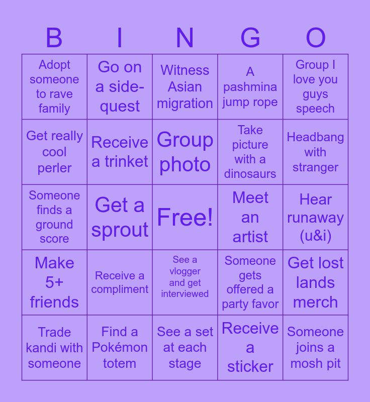 This bingo card has a free space and 24 words: Receive a compliment, Find a Pokémon totem, Group photo, Trade kandi with someone, Group I love you guys speech, Adopt someone to rave family, Get really cool perler, Go on a side-quest, Meet an artist, See a vlogger and get interviewed, Take picture with a dinosaurs, Someone finds a ground score, Someone gets offered a party favor, Get lost lands merch, Receive a trinket, Receive a sticker, Hear runaway (u&i), Witness Asian migration, Headbang with stranger, Get a sprout, Someone joins a mosh pit, Make 5+ friends, A pashmina jump rope and See a set at each stage.