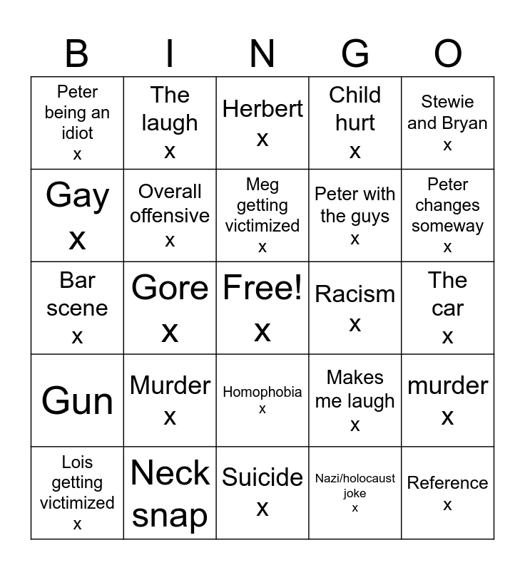 This bingo card has a free space and 24 words: Murder x, Neck snap, Meg getting victimized x, Lois getting victimized x, Stewie and Bryan x, Peter being an idiot x, Gay x, The laugh x, Racism x, Homophobia x, Peter with the guys x, Bar scene x, Makes me laugh x, murder x, Overall offensive x, Nazi/holocaust joke x, The car x, Herbert x, Peter changes someway x, Gore x, Reference x, Gun, Child hurt x and Suicide x.