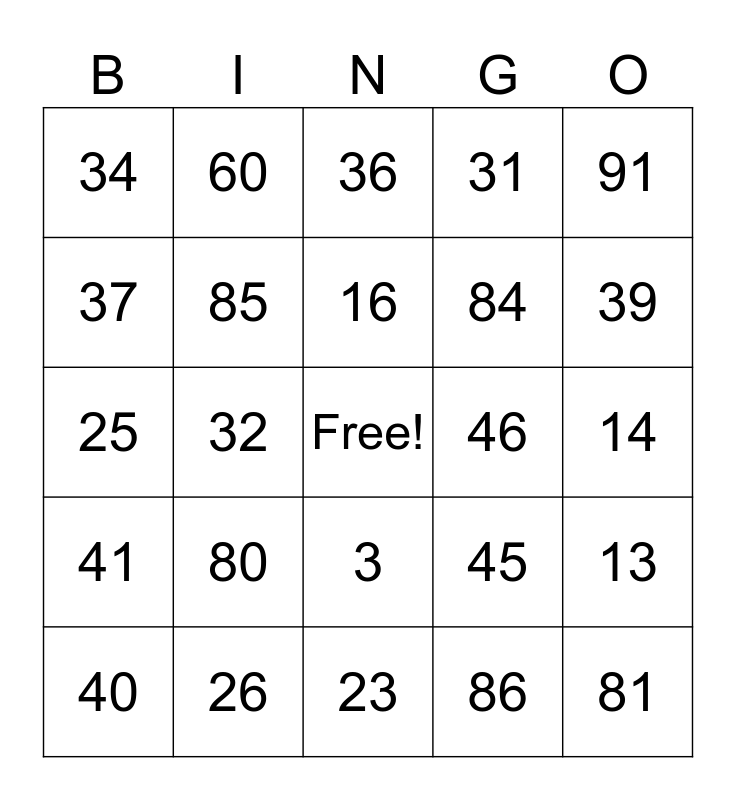 This bingo card has a free space and 89 words: 1, 2, 3, 4, 5, 6, 7, 8, 9, 10, 11, 12, 13, 14, 15, 16, 17, 18, 19, 20, 21, 22, 23, 24, 25, 26, 27, 28, 29, 30, 31, 32, 33, 34, 35, 36, 37, 38, 39, 40, 41, 42, 43, 44, 45, 46, 47, 48, 59, 60, 61, 62, 63, 64, 65, 66, 67, 68, 69, 70, 71, 72, 73, 74, 75, 76, 77, 78, 79, 80, 81, 82, 83, 84, 85, 86, 87, 88, 89, 90, 91, 92, 93, 94, 95, 96, 97, 98 and 99.
