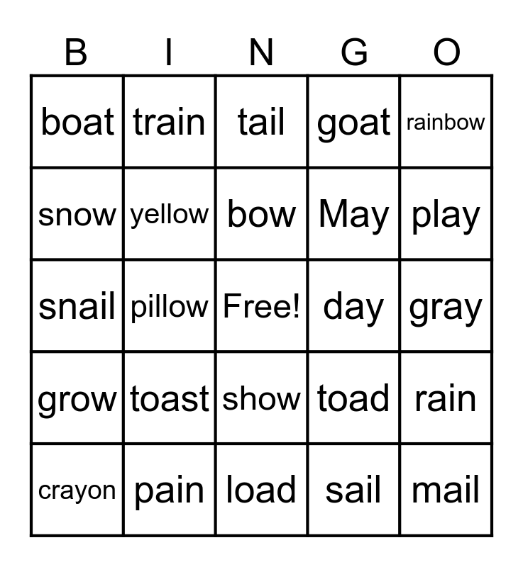 This bingo card has a free space and 24 words: toast, pain, bow, crayon, rainbow, boat, snow, train, day, show, May, snail, toad, rain, yellow, sail, gray, tail, play, pillow, mail, grow, goat and load.