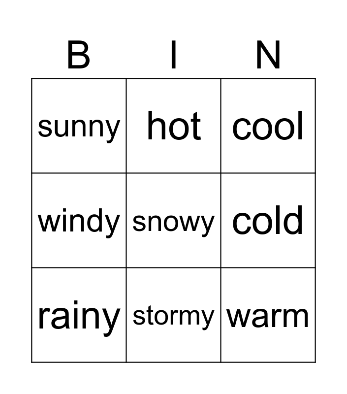 This bingo card has a free space and 8 words: cold, cool, hot, rainy, sunny, warm, windy and stormy.